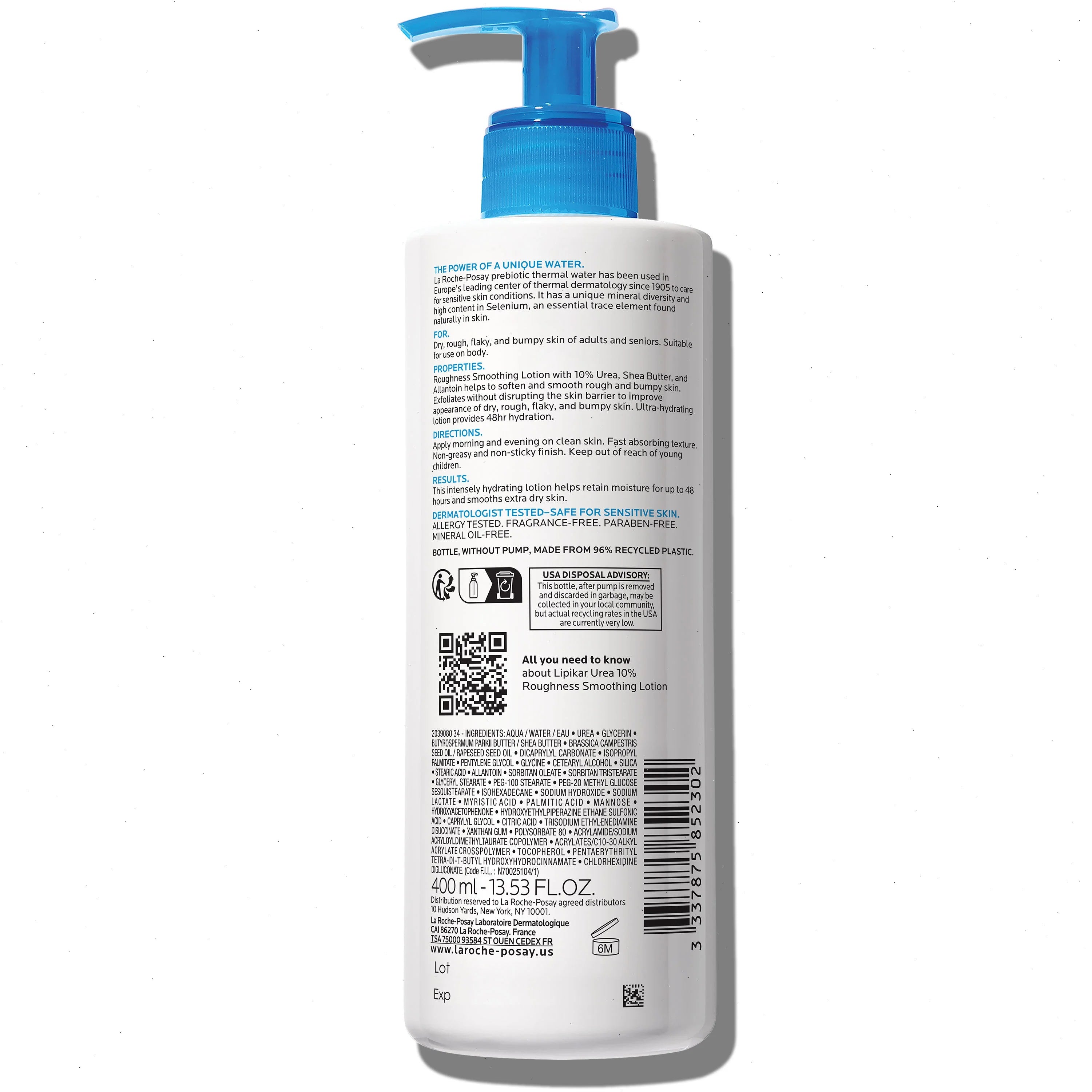 Lipikar Urea 10% Roughness Smoothing Lotion exfoliates skin without disrupting the skin barrier and softens and smooths dry, rough, and bumpy skin with only 1 application. This ultra-hydrating body lotion provides up to 48 hour hydration and improves skin's moisture barrier in 1 hour in a non-sticky, fast-absorbing texture.